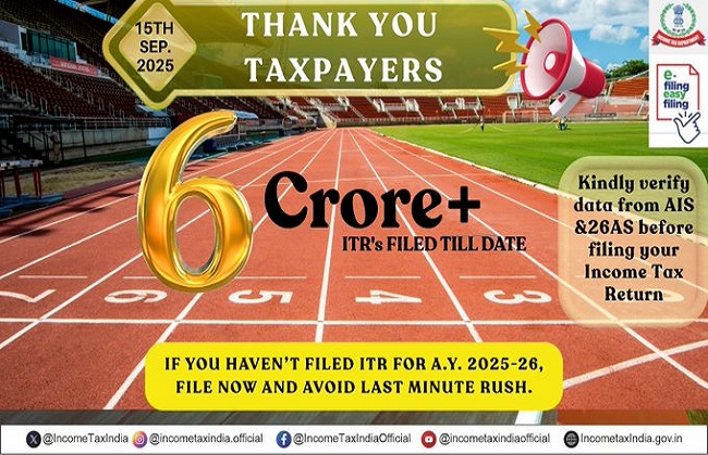 नई दिल्‍ली | आयकर विभाग ने शनिवार को कहा कि आकलन वर्ष 2025-26 के लिए अब तक छह करोड़ से अधिक आयकर रिटर्न (आईटीआर) दाखिल किए जा चुके हैं। बिना जुर्माने के आईटीआर दाखिल करने की आखिरी तारीख 15 सितंबर है।