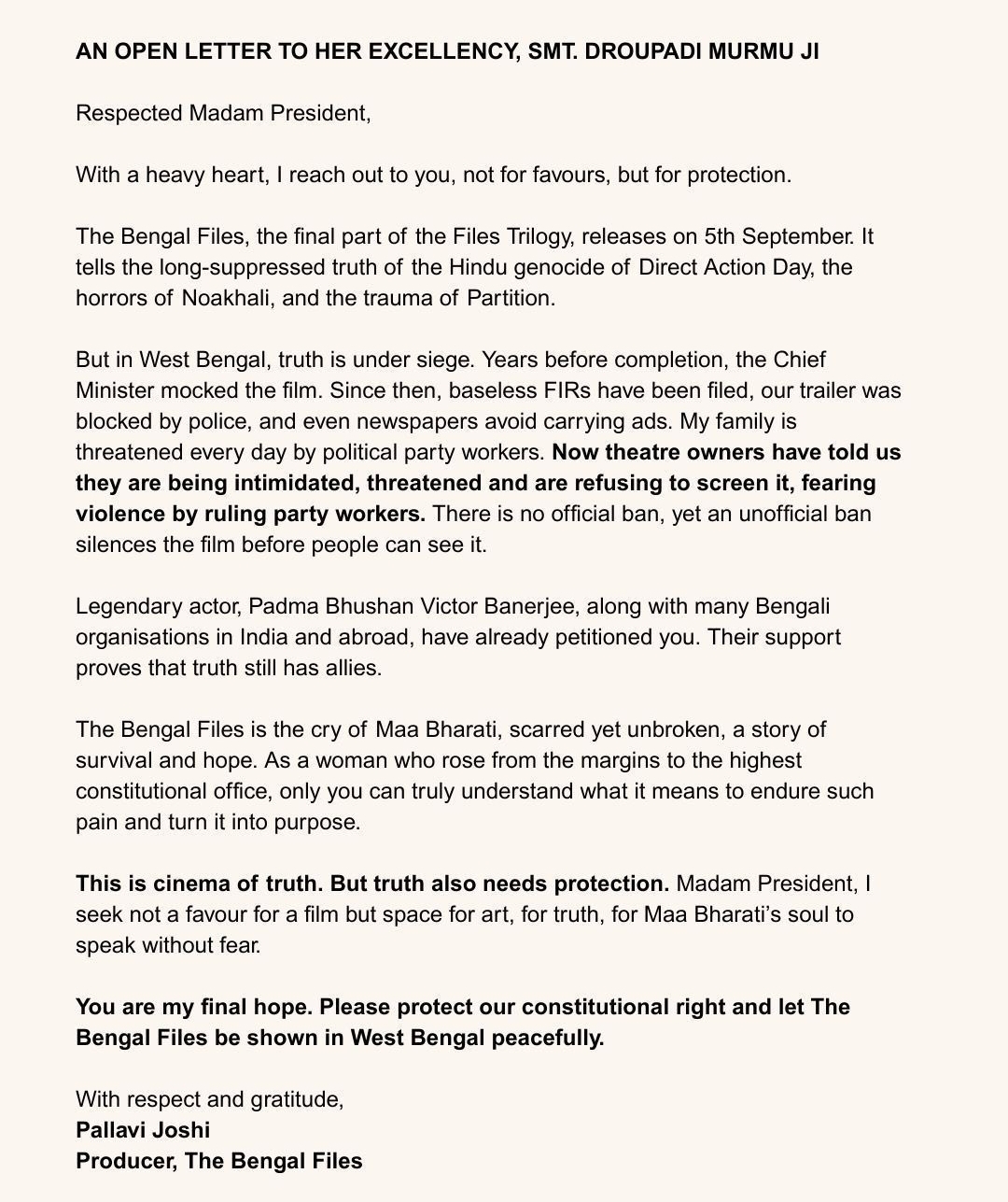 इस फिल्म की निर्माता पल्लवी जोशी ने अपने पत्र लिखा है कि `द बंगाल फाइल्स’ की निर्माता होने के नाते मुझे गहरा दुख है कि बंगाल के मल्टीप्लेक्स चेन ने सत्ताधारी पार्टी के राजनीतिक दबाव और धमकियों के चलते फ़िल्म की रिलीज़ से इनकार कर दिया है। उन्होंने निवेदन किया कि उनके संवैधानिक अधिकारों की रक्षा की जाए और इस फ़िल्म की बंगाल में रिलीज़ सुनिश्चित की जाए।