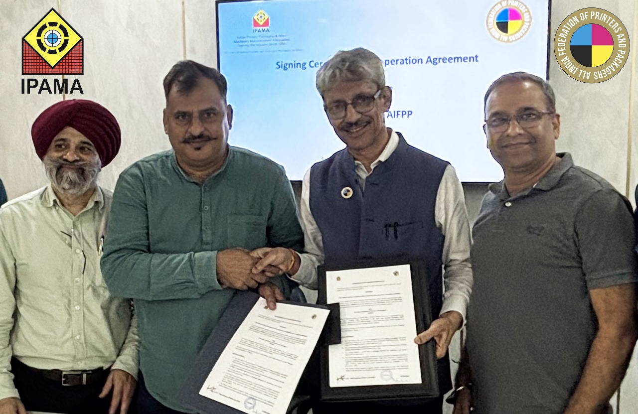 नई दिल्ली | भारत के प्रिंटिंग और पैकेजिंग उद्योग को नई दिशा देने वाले एक अभूतपूर्व कदम के तहत इंडियन प्रिंटिंग पैकेजिंग एंड अलाइड मशीनरी मैन्युफैक्चरर्स एसोसिएशन (आईपीएएमए) और ऑल इंडिया फेडरेशन ऑफ प्रिंटर्स एंड पैकेजर्स (एआईएफपीपी) ने एक महत्वपूर्ण समझौता ज्ञापन (एमओयू) पर हस्ताक्षर किए।