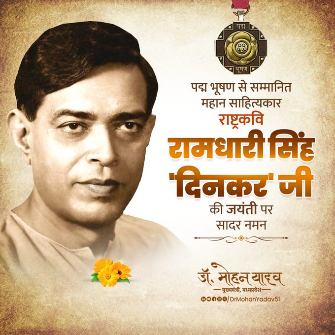 भाेपाल | देश के प्रसिद्ध साहित्यकार, आधुनिक युग के श्रेष्ठ वीर रस के कवि, ज्ञानपीठ एवं पद्मभूषण से सम्मानित महान राष्ट्रकवि रामधारी सिंह दिनकर की मंगलवार काे जयंती पर पूरा देश उन्हें याद कर रहा है। इस अवसर पर मुख्यमंत्री डॉ. माेहन यादव ने भी उन्हें स्मरण कर विनम्र नमन किया है।