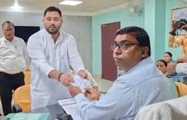 Bihar | राष्ट्रीय जनता दल (राजद) के वरिष्ठ नेता और बिहार विधानसभा में नेता प्रतिपक्ष तेजस्वी प्रसाद यादव ने बुधवार को राघोपुर विधानसभा क्षेत्र के निर्वाची पदाधिकारी सह सदर अनुमंडल पदाधिकारी रामबाबू बैठा के कार्यालय कक्ष में नामांकन पत्र दाखिल किया।