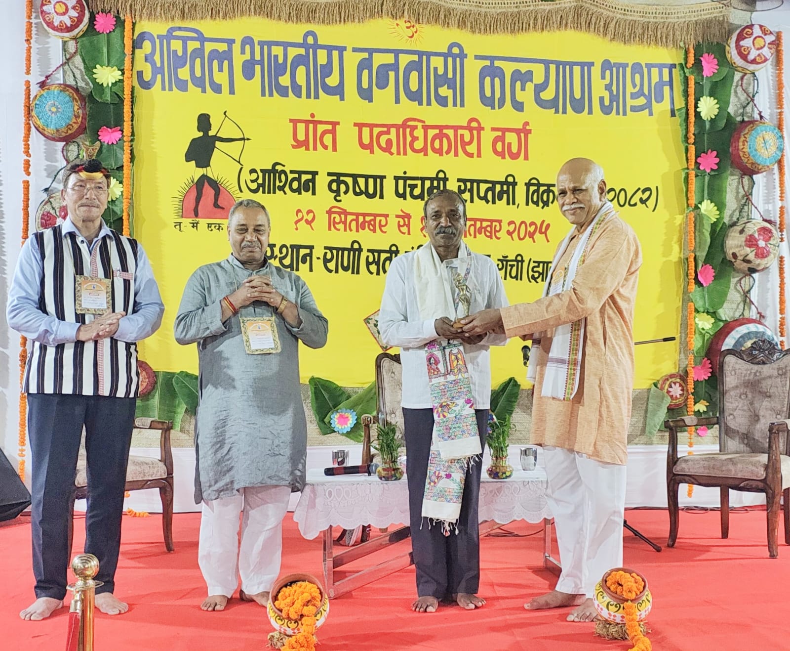 रांची | झारखंड की राजधानी रांची स्थित राणी सती मंदिर परिसर में आयोजित वनवासी कल्याण आश्रम के प्रांत पदाधिकारियों के तीन दिवसीय प्रशिक्षण वर्ग का रविवार को समापन हो गया। इस अवसर पर विभिन्न प्रांतो से आए पदाधिकीरियों को आयोग की ओर से किये जा रहे कार्यों से अवगत कराया गया, साथ ही उत्कृष्ट कार्य करने वाले पदाधिकीरियों को सम्मानित किया गया।