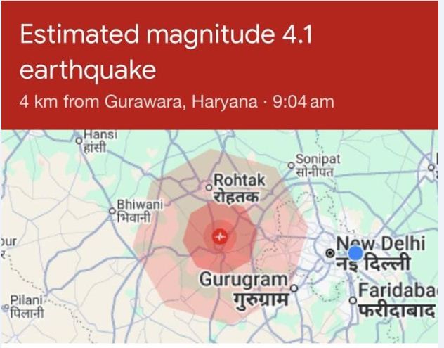 गुरुग्राम, रोहतक, सोनीपत, झज्जर, हिसार सहित कई हिस्सों में गुरुवार सुबह करीब नौ बजकर पांच मिनट पर भूकंप के झटके महसूस हुए। इसका केंद्र झज्जर रहा। भूकंप की तीव्रता रिक्टर स्केल पर 4.1 मापी गई। यहां करीब 10 कि.मी. नीचे धरती में हलचल महसूस की गई है। किसी ने जमीन के नीचे ट्रेन की तरह आवाज सुनाई देने का दावा किया तो किसी ने डरावनी आवाज सुनने की बात कही।