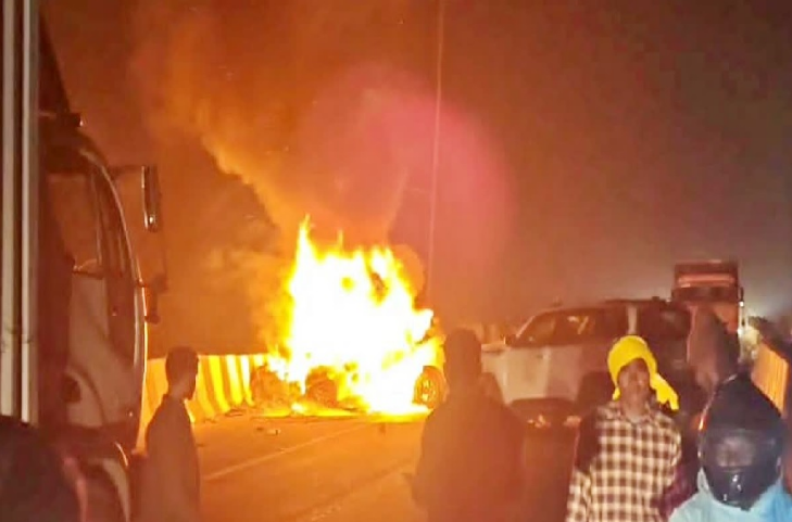 नालंदा जिले में बुधवार देर शाम NH-20 पर देवधा ओवरब्रिज के पास बड़ा सड़क हादसा हो गया। तेज रफ्तार मारुति कार और स्कॉर्पियो की आमने-सामने हुई जोरदार टक्कर के बाद मारुति कार में अचानक आग लग गई। कुछ ही सेकंड में आग ने पूरी कार को अपनी चपेट में ले लिया। कार में सवार पांच युवक गंभीर रूप से झुलस गए। सभी को तुरंत वीआईएमएस पावापुरी रेफर किया गया, जहां इलाज के दौरान पटना जिले के बाढ़ थाना क्षेत्र के 26 वर्षीय दिव्यांशु कुमार की मौत हो गई। अन्य घायलों में हरनौत निवासी सम्राट कुमार, बेगूसराय निवासी रमण कुमार, बाढ़ निवासी रिशू कुमार और अंशु कुमार शामिल हैं। सभी की हालत चिंताजनक बनी हुई है। प्रत्यक्षदर्शियों के अनुसार, रांची से पटना जा रही मारुति कार की सामने से आ रही स्कॉर्पियो से तेज रफ्तार में टक्कर हो गई थी। टक्कर के बाद कार में आग लग गई और पांचों युवक झुलसते हुए किसी तरह बाहर निकल पाए। घटना की जानकारी मिलते ही दीपनगर पुलिस और फायर ब्रिगेड की टीम मौके पर पहुंची और कड़ी मशक्कत के बाद आग पर काबू पाया गया। दीपनगर थानाध्यक्ष राजमणि ने बताया कि दोनों वाहनों को जब्त कर लिया गया है। स्कॉर्पियो चालक फरार बताया जा रहा है, जिसकी तलाश जारी है।