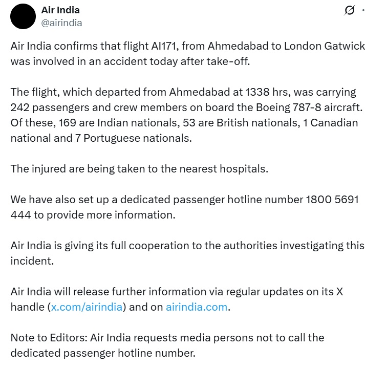 Ahmedabad Plane Crash hotline number: हादसे के बाद एयर इंडिया द्वारा एक यात्री हॉटलाइन नंबर 1800 5691 444 जारी किया गया है, जहां विमान दुर्घटना के बारे में जानकारी ली जा सकती है।
