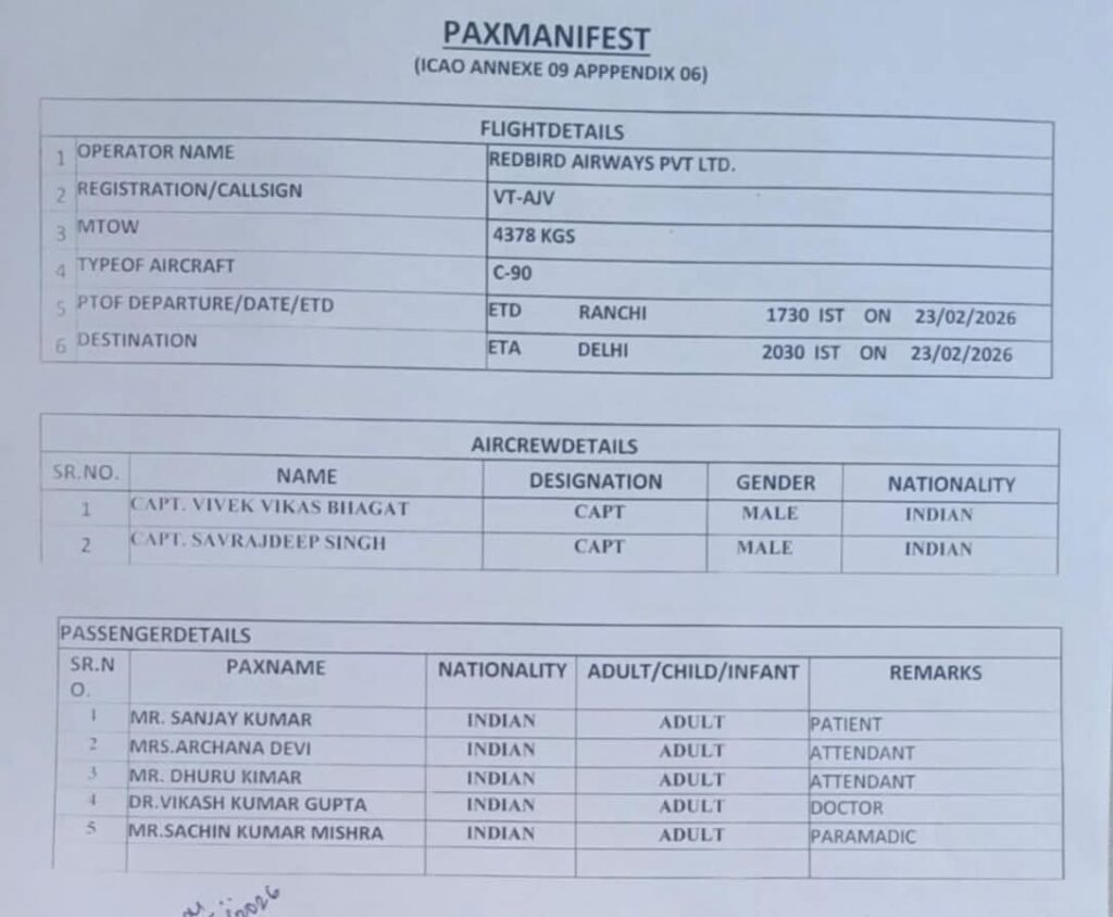 चतरा | रांची: झारखंड के चतरा जिले से एक बेहद दुःखद और बड़ी खबर सामने आ रही है। रांची के बिरसा मुंडा एयरपोर्ट से दिल्ली के लिए उड़ान भरने वाला एक मेडिकल एंबुलेंस एयरक्राफ्ट (Air Ambulance) तकनीकी खराबी के बाद रडार से गायब हो गया और सिमरिया थाना क्षेत्र में दुर्घटनाग्रस्त हो गया है।
