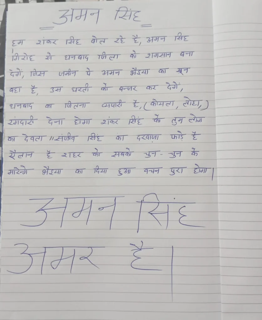 शंकर सिंह के नाम से जारी प्रेस विज्ञप्ति में कहा गया है कि जिस जमीन पर अमन सिंह का खून बहा है, उस धरती को बंजर बना दिया जाएगा। विज्ञप्ति में धनबाद के व्यापारियों, विशेष रूप से कोयला और लोहे से जुड़े कारोबारियों से रंगदारी की मांग की गई है। शंकर सिंह ने चेतावनी दी है कि उनकी मांगें नहीं मानने वालों को चुन-चुनकर मारा जाएगा। बयान में संजीव सिंह का नाम लेते हुए भी गंभीर धमकी दी गई है।