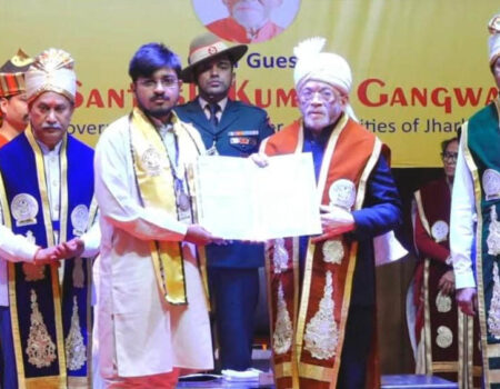 सोमवार को बिनोद बिहारी महतो कोयलांचल विश्वविद्यालय, धनबाद में आयोजित दीक्षांत समारोह के दौरान महामहिम राज्यपाल द्वारा अनिकेत साहू को गोल्ड मेडल एवं प्रशस्ति पत्र प्रदान कर सम्मानित किया गया। समारोह में विश्वविद्यालय के कुलपति, शिक्षकगण तथा बड़ी संख्या में छात्र-छात्राएं उपस्थित थे।