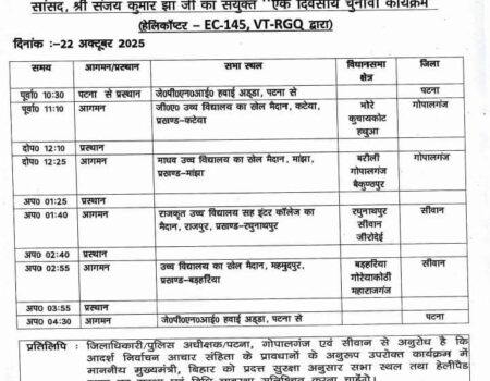 मुख्यमंत्री नीतीश कुमार 22 अक्टूबर को गोपालगंज और सिवान में करेंगे चार चुनावी सभाएं