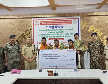 । लातेहार एसपी कुमार गौरव के समक्ष गुरुवार को झारखंड जनमुक्ति परिषद (जेजेएमपी) नक्सली संगठन के तीन इनामी नक्सलियों ने गुरुवार को आत्मसमर्पण कर दिया। एसपी कुमार गौरव और सीआरपीएफ 11 बटालियन के कमांडेंट याद राम बुनकर ने तीनों नक्सलियों को माला पहनाकर स्वागत किया।