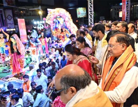 रायपुर | मुख्यमंत्री विष्णुदेव साय साेमवार देर रात राजधानी रायपुर के हृदयस्थल जयस्तंभ चौक स्थित नगर निगम द्वारा निर्मित स्वागत मंच पर पहुंचे और ऐतिहासिक गणेश विसर्जन यात्रा में शामिल होकर झांकियों का अभिनंदन किया। कार्यक्रम को संबोधित करते हुए उन्होंने कहा कि रायपुर की गणेश विसर्जन झांकी अत्यंत ऐतिहासिक परंपरा का प्रतीक है। इस अवसर पर उन्होंने विघ्नहर्ता गणेश से छत्तीसगढ़ की खुशहाली और समृद्धि की कामना भी की। मुख्यमंत्री साय ने ऐतिहासिक विसर्जन यात्रा में आमंत्रित करने के लिए आयोजकों के प्रति आभार व्यक्त किया।