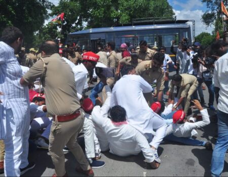 छात्रों पर लाठीचार्ज के विरोध में सपा छात्रसभा ने राजभवन के सामने किया प्रदर्शन