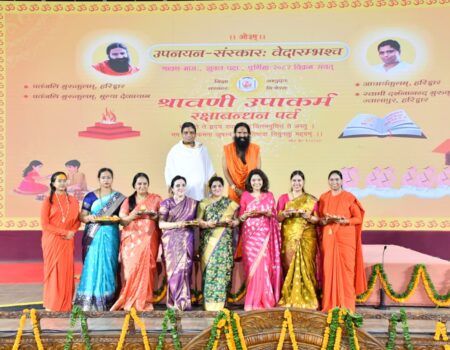 योग गुरु रामदेव व आचार्य बालकृष्ण के सानिध्य में पतंजलि योगपीठ में श्रावणी उपाकर्म के साथ रक्षाबंधन पर्व मनाया गया। इस अवसर पर यज्ञ के साथ पतंजलि गुरुकुलम् व आचार्यकुलम् के छात्र-छात्राओं का उपनयन संस्कार कराया गया। बहन रेनू श्रीवास्तव, साध्वी देवप्रिया, डॉ. ऋतम्भरा शास्त्री, बहन अंशुल, बहन पारूल के साथ-साथ पतंजलि गुरुकुलम् व आचार्यकुलम् की छात्राओं तथा संन्यासिनी बहनों ने स्वामी रामदेव व आचार्य बालकृष्ण को राखी बांधकर रक्षा का आशीर्वाद लिया।