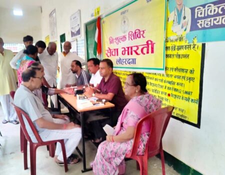 लोहरदगा | सेवा भारती लोहरदगा की ओर सेचुन्नीलाल उच्च विद्यालय के प्रांगण मे निशुल्क स्वास्थ्य जांच एवं चिकित्सा शिविर का आयोजन रविवार को किया गया। जिला अध्यक्ष दीपक सर्राफ, डॉ कुमुद अग्रवाल, उपाध्यक्ष अवधेश मित्तल, सहसचिव संजय चौधरी और शिव प्रसाद पोद्दार ने संयुक्त रूप से भारत माता के तस्वीर के समक्ष दीप प्रज्वलित कर एवं पुष्प चढ़ाकर कार्यक्रम का शुभारंभ किया।