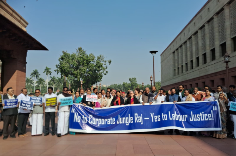 नेताओं ने पोस्टर और बैनर लेकर ‘श्रमिकों के हक़ बचाओ’, ‘कॉपोरेट जंगलराज को ना कहें’, ‘श्रमिक न्याय हो’ और ‘श्रमिक विरोधी कानून वापस लो’ जैसे नारे लगाए।