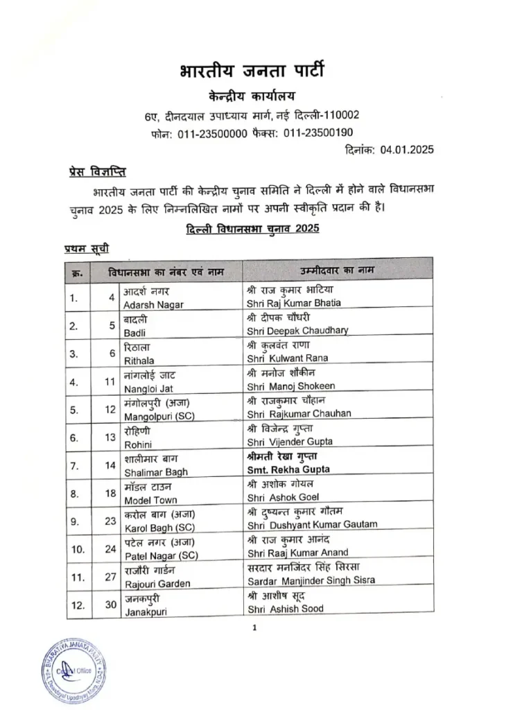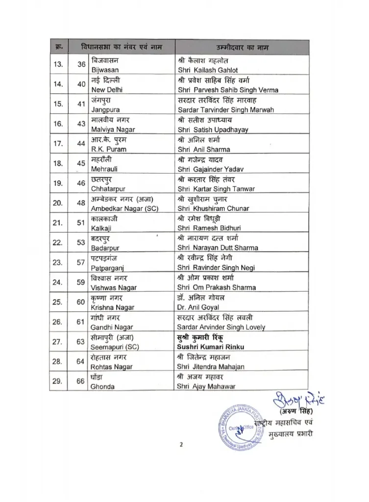 दिल्ली। भारतीय जनता पार्टी (भाजपा) ने दिल्ली विधानसभा चुनाव के लिए शनिवार को 29 उम्मीदवारों की अपनी पहली सूची जारी कर दी। पहली सूची में पश्चिम दिल्ली के पूर्व सांसद प्रवेश वर्मा का मुकाबला आप प्रमुख और पूर्व मुख्यमंत्री अरविंद केजरीवाल के खिलाफ नई दिल्ली निर्वाचन क्षेत्र से है। दक्षिण दिल्ली के पूर्व सांसद रमेश बिधूड़ी का मुकाबला कालकाजी से मुख्यमंत्री आतिशी से होगा जबकि आप के पूर्व मंत्री कैलाश गहलोत को नजफगढ़ की जगह बिजवासन से मैदान में उतारा गया है। पार्टी ने गांधी नगर के विधायक अनिल बाजपेयी को टिकट देकर दिल्ली कांग्रेस के पूर्व प्रमुख अरविंदर सिंह लवली को टिकट दिया है।