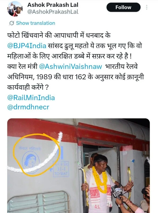 धनबाद सांसद ढुलू महतो महिला बोगी में चढ़ने पर विवाद में घिरे, वायरल फोटो के बाद जांच शुरू