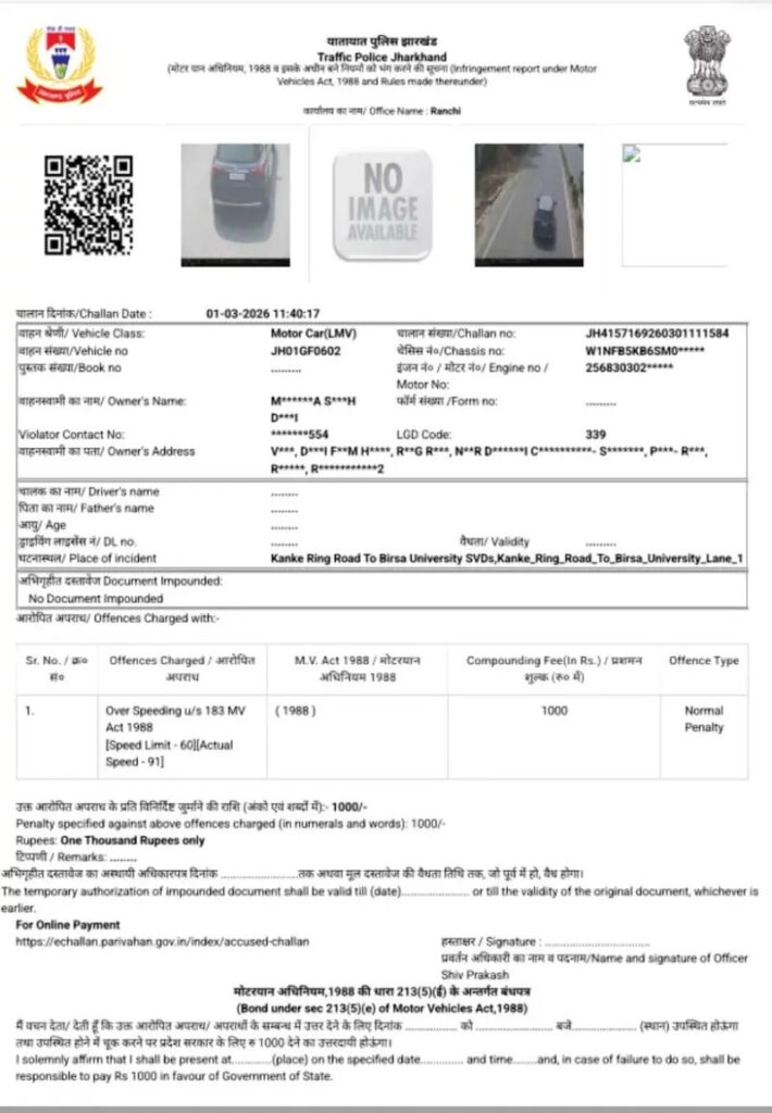 रांची के राजकुमार व भारतीय क्रिकेट टीम के पूर्व कप्तान महेंद्र सिंह धोनी की ब्लैक मर्सिडीज कार का कटा चालान। 1000 रुपये का चालान काटा गया है। जानकारी के अनुसार यह चालान ओवरस्पीडिंग के कारण किया गया है। बताया जा रहा है कि धोनी की कार देवरी मंदिर जाने के क्रम में निर्धारित गति सीमा से अधिक रफ्तार में चल रही थी, जिसके बाद ट्रैफिक नियमों के उल्लंघन पर चालान जारी किया गया। ट्रैफिक विभाग की ओर से जारी ई-चालान में ओवरस्पीडिंग को कारण बताया गया है। नियमों के तहत गाड़ी की गति तय सीमा से अधिक पाए जाने पर 1000 रुपये का जुर्माना लगाया गया है।