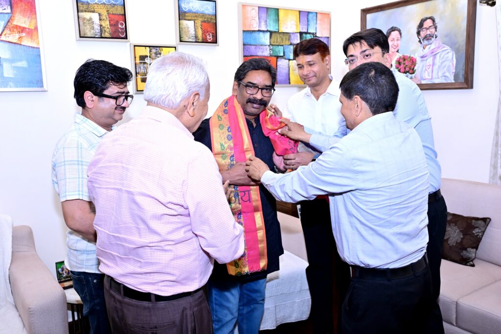 रांची: 7 मार्च 2026 को कांके रोड स्थित मुख्यमंत्री आवासीय कार्यालय में मुख्यमंत्री हेमंत सोरेन से दिगंबर जैन पंचायत, जैन मंदिर, अपर बाजार रांची के एक प्रतिनिधिमंडल ने मुलाकात की। इस अवसर पर प्रतिनिधिमंडल ने मुख्यमंत्री को आगामी पंचकल्याणक प्रतिष्ठा महोत्सव में सम्मिलित होने के लिए आमंत्रित किया, जो 01 से 6 अप्रैल 2026 तक जिला स्कूल परिसर, रांची में आयोजित किया जाएगा।