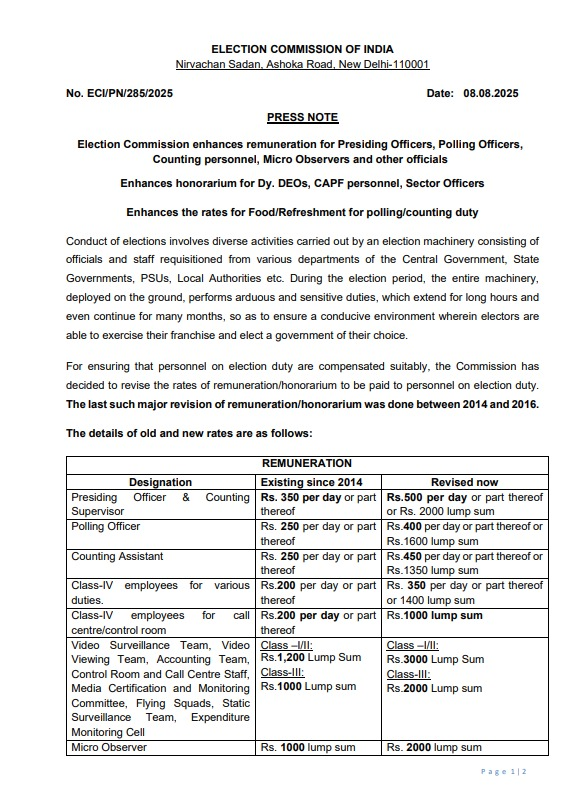 नई दिल्ली। चुनाव आयोग ने बड़ा फैसला लेते हुए चुनाव अधिकारियों के मानदेय को बढ़ा दिया है। आयोग ने पीठासीन अधिकारियों, मतदान अधिकारियों, मतगणना कार्मिकों, माइक्रो ऑब्जर्वरों और अन्य अधिकारियों के पारिश्रमिक में वृद्धि की है। इसके अलावा, उप जिला निर्वाचन अधिकारियों, सीएपीएफ कार्मिकों और सेक्टर अधिकारियों के मानदेय में भी वृद्धि की गई है। साथ ही मतदान या मतगणना ड्यूटी के लिए भोजन-जलपान की दरों में वृद्धि की है।