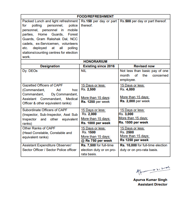 यह सुनिश्चित करने के लिए कि चुनाव ड्यूटी पर तैनात कार्मिकों को उचित पारिश्रमिक मिले, आयोग ने चुनाव ड्यूटी पर तैनात कार्मिकों को दिए जाने वाले पारिश्रमिक/मानदेय की दरों में संशोधन करने का निर्णय लिया है। मानदेय में अंतिम बार इतना बड़ा संशोधन 2014 और 2016 के बीच किया गया था।