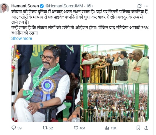मुख्यमंत्री ने अपने संबोधन में भाजपा पर तीखा हमला बोला और असम में आदिवासियों की स्थिति का उल्लेख किया। उन्होंने कोयला खनन में लगी आउटसोर्सिंग कंपनियों में स्थानीय युवाओं को 75 प्रतिशत रोजगार सुनिश्चित करने पर जोर दिया। उन्होंने कहा कि यदि आउटसोर्सिंग कंपनियां स्थानीय युवाओं को रोजगार नहीं देतीं, तो उनके खिलाफ सख्त कदम उठाए जाने चाहिए।