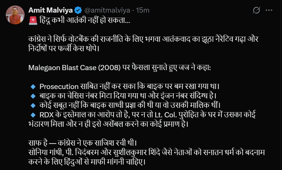 अदालत के फैसले के बाद भाजपा आईटी सेल के प्रमुख अमित मालवीय ने एक्स पर लिखा, “हिंदू कभी आतंकी नहीं हो सकता। कांग्रेस ने सिर्फ वोटबैंक की राजनीति के लिए भगवा आतंकवाद का झूठा नैरेटिव गढ़ा और निर्दोषों पर फर्जी केस थोपे।” उन्होंने आगे लिखा, “साफ है कांग्रेस ने एक साजिश रची थी। सोनिया गांधी, पी. चिदंबरम और सुशीलकुमार शिंदे जैसे नेताओं को सनातन धर्म को बदनाम करने के लिए हिंदुओं से माफी मांगनी चाहिए। सनातन धर्म पवित्र है। हिंदू आतंकवादी नहीं हो सकता। गर्व से कहो हम हिंदू हैं।”