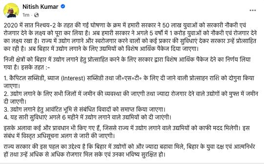 नीतीश कुमार ने अपने एक्स हैंडल पर पोस्ट कर शनिवार को लिखा कि 2020 में सात निश्चय-2 के तहत की गई घोषणा के क्रम में हमारी सरकार ने 50 लाख युवाओं को सरकारी नौकरी एवं रोजगार देने के लक्ष्य को पूरा कर लिया है। अब हमारी सरकार ने अगले 5 वर्षों में 1 करोड़ युवाओं को नौकरी एवं रोजगार देने का लक्ष्य रखा है। राज्य में उद्योग लगाने और स्वरोजगार करने वालों को कई प्रकार की सुविधाएं देकर सरकार उन्हें प्रोत्साहित कर रही है। अब बिहार में उद्योग लगाने के लिए उद्यमियों को विशेष आर्थिक पैकेज दिया जाएगा।