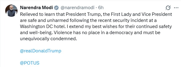 पीएम मोदी ने सोशल मीडिया प्लेटफॉर्म X पर पोस्ट करते हुए कहा कि उन्हें राहत है कि Donald Trump, फर्स्ट लेडी Melania Trump और उपराष्ट्रपति JD Vance सुरक्षित हैं। उन्होंने सभी की कुशलता की कामना करते हुए कहा कि ऐसी घटनाओं की स्पष्ट रूप से निंदा की जानी चाहिए।