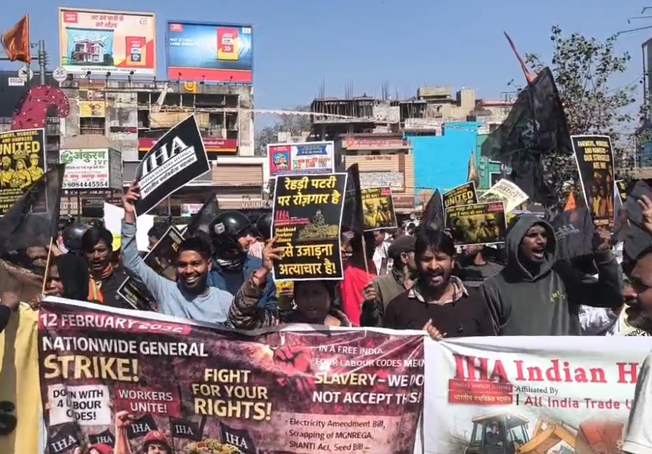 रांची: ट्रेड यूनियनों और किसान संगठनों द्वारा केंद्र सरकार की कथित मजदूर-किसान विरोधी नीतियों के खिलाफ बुलाए गए देशव्यापी भारत बंद और हड़ताल के समर्थन में गुरुवार को रांची में प्रदर्शन किया गया। भारतीय पथ विक्रेता संघ के बैनर तले पथ विक्रेताओं ने मेन रोड स्थित फिराया लाल चौक पर सड़क जाम कर विरोध जताया।