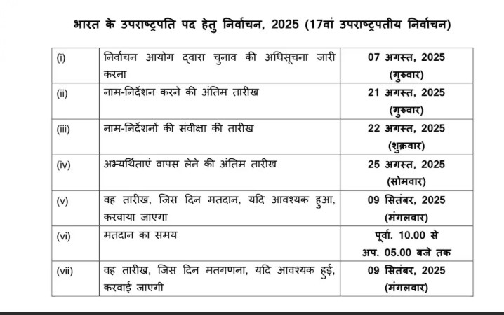 उप राष्ट्रपति चुनाव के लिए 7 अगस्त को अधिसूचना जारी की जाएगी। 21 अगस्त को नाम निर्देशन करने की अंतिम तारीख है। 22 अगस्त को नामांकन पत्रों की समीक्षा की जाएगी। 25 अगस्त तक नामांकन वापस लिए जा सकेंगे। इस पद के लिए एक से अधिक उम्मीदवार होने पर 9 सितंबर को चुनाव होगा। जिसमें राज्यसभा के 233 सदस्य, 12 राज्यसभा के नामित सदस्य और 543 लोकसभा के सदस्य मतदान करेंगे।