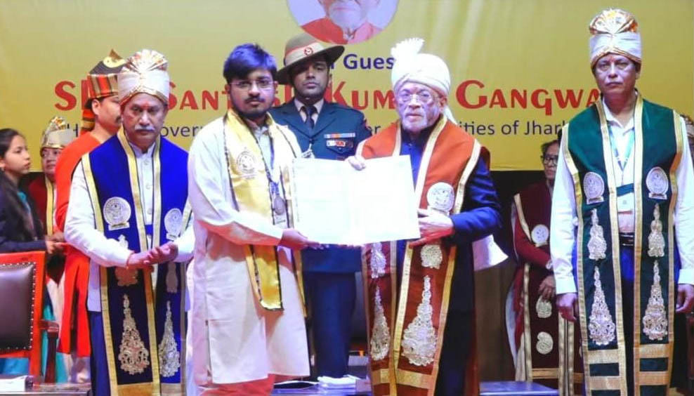 सोमवार को बिनोद बिहारी महतो कोयलांचल विश्वविद्यालय, धनबाद में आयोजित दीक्षांत समारोह के दौरान महामहिम राज्यपाल द्वारा अनिकेत साहू को गोल्ड मेडल एवं प्रशस्ति पत्र प्रदान कर सम्मानित किया गया। समारोह में विश्वविद्यालय के कुलपति, शिक्षकगण तथा बड़ी संख्या में छात्र-छात्राएं उपस्थित थे।